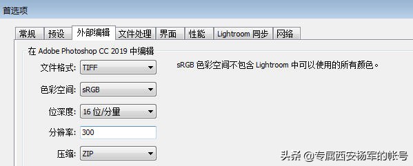 同时如果在Lightroom中修改照片还需要另外同步到Photoshop中修改,那么需要在【编辑】菜单中的【首选项】-【外部编辑】里设置同步到ps中的色彩空间为sRGB。(如果照片只用于网络发布,同步到ps就选择sRGB,如果是用于印刷就选择aRGB)