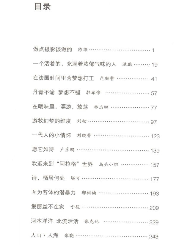 陈维、迟鹏、范顺赞、韩军伟、编号223、刘韧、刘晓芳、卢彦鹏、鸟头小组、塔可、邬树楠、于筱、张克纯、张晓、朱阳……用文字揭示年轻一代摄影艺术家的真实思想与生活,用影像表达艺术新主力的先锋观念与精神。