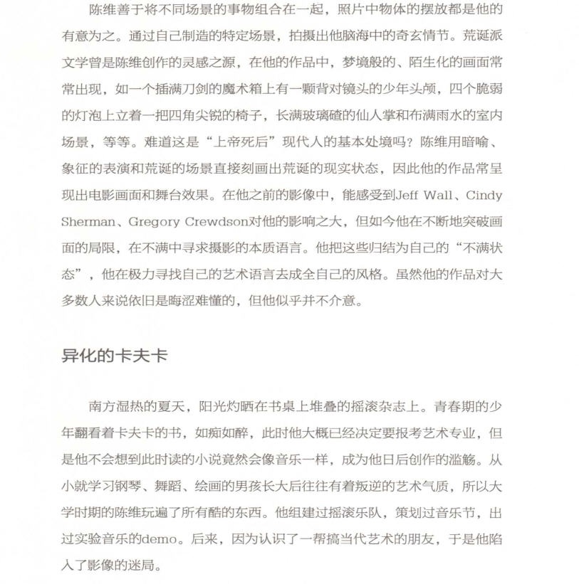 作者采访了中国当代炙手可热的众多青年摄影家,他们将天马行空的思考带入影像,他们用艺术的视角去阐释芸芸众生,他们游走在想象与现实,拯救与逍遥之间。他们捕捉光阴的契机,他们将会成为新思潮的卷首语!